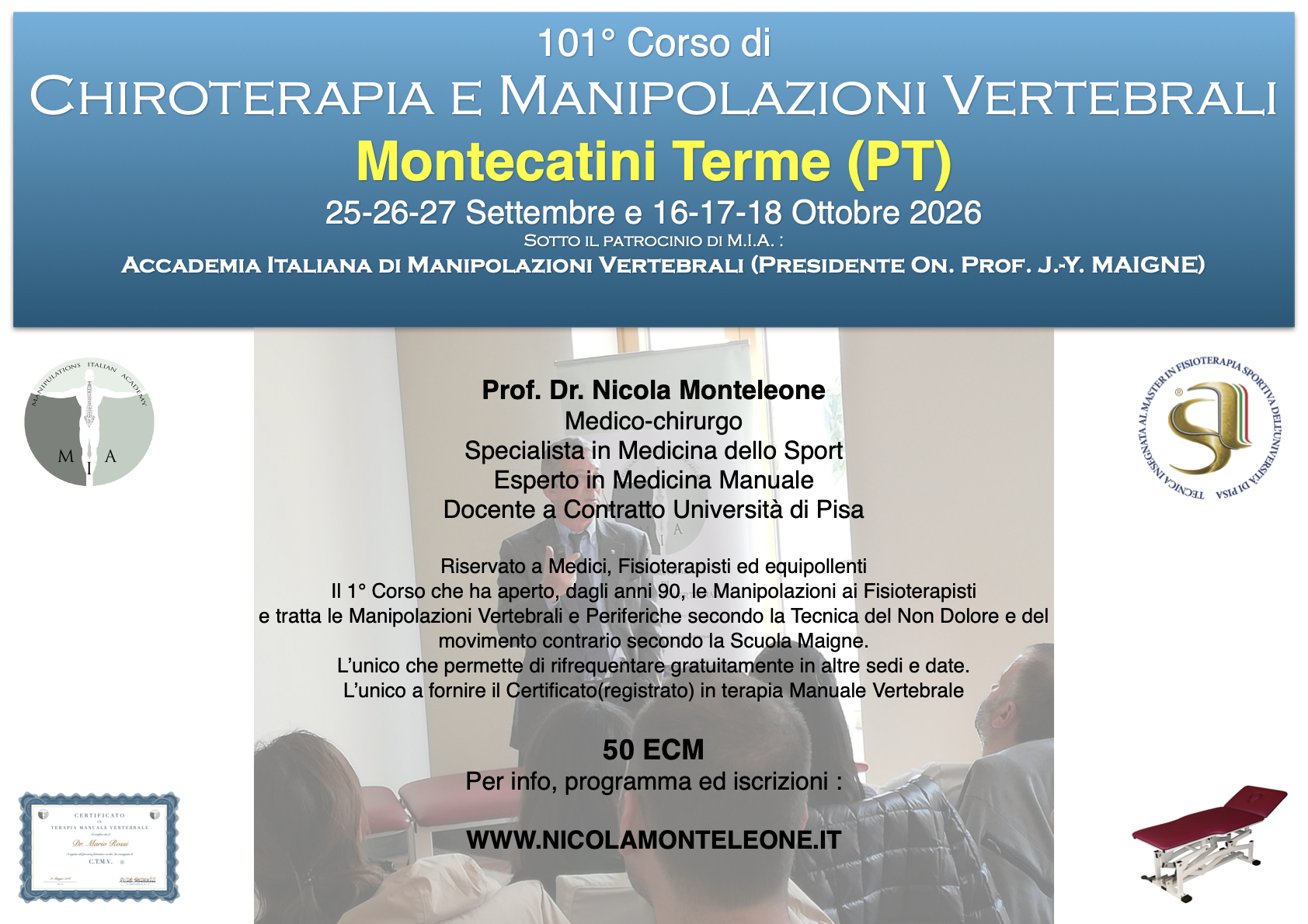 II primo Corso che ha aperto dagli anni 90 la Manipolazione Vertebrale ai FisioterapistiL'unico patrocinato dall'Accademia Italiana di Manipolazioni Vertebrali